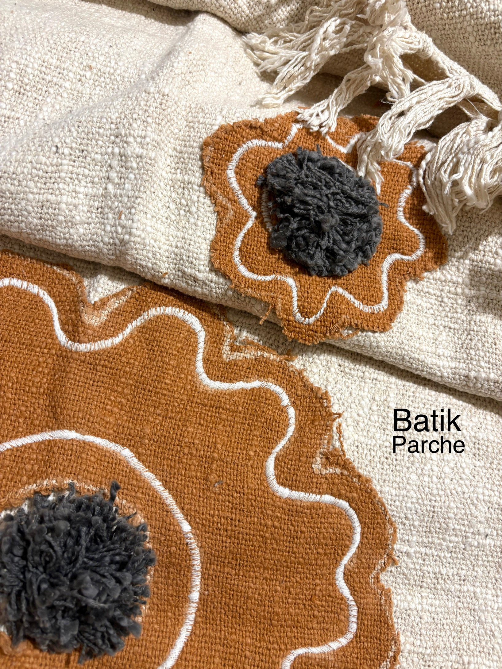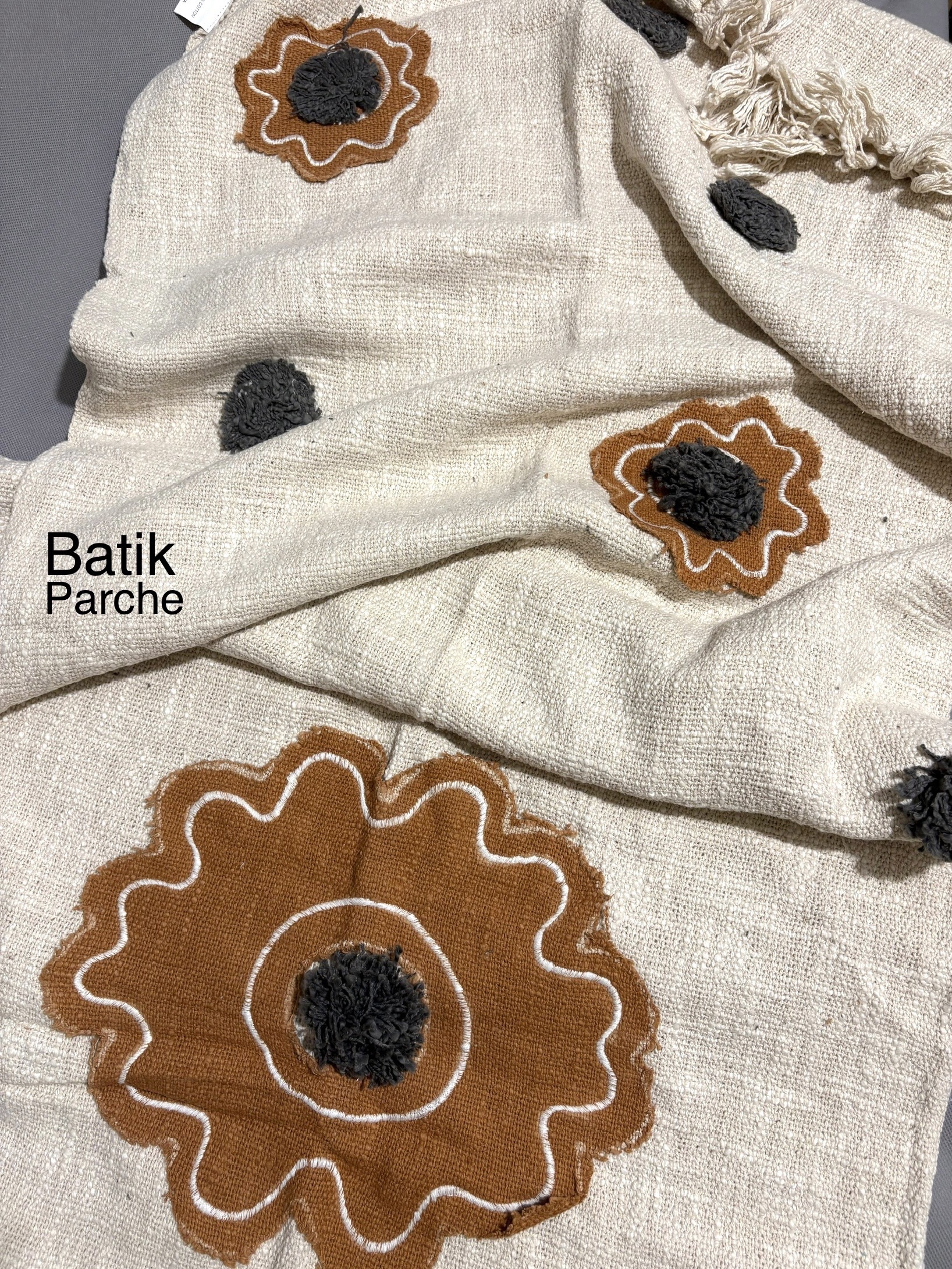 این پارچهی دستساز با عرض ۱۳۵ و طول ۱۷۵ سانتیمتر، دارای بافتی ضخیم و طبیعی است که از متریال الهامگرفته از بافت نپالی ساخته شده. زمینهی روشن پارچه با گلهای بزرگ و دستدوز به رنگ قهوهای آجری و مرکز پفی خاکستری تزئین شده که جلوهای چشمگیر و خاص به آن میبخشد.