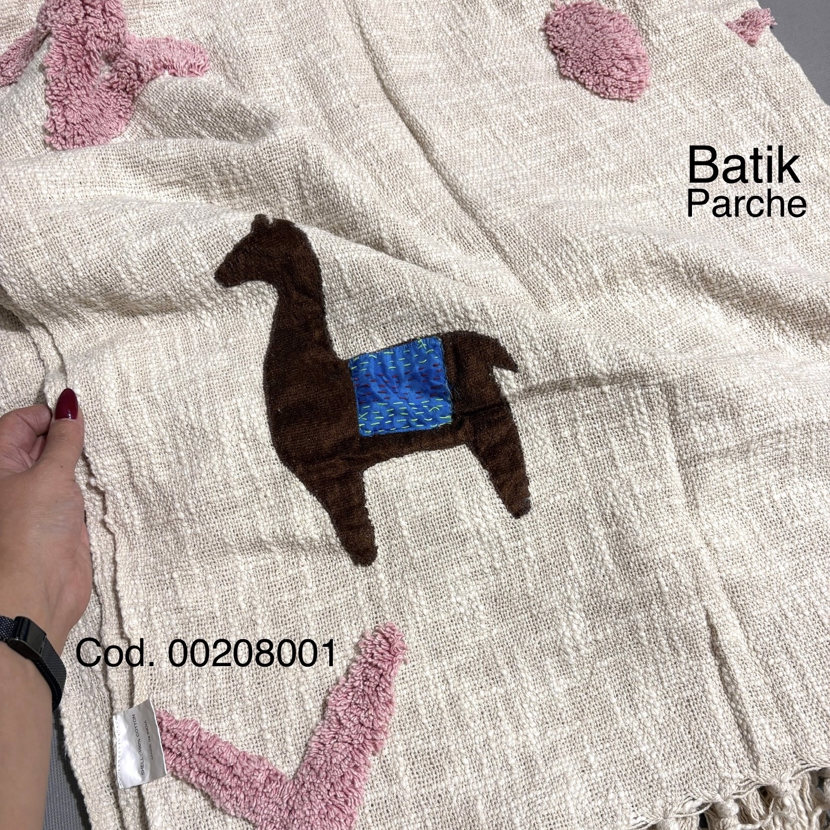 پارچهای با اصالت و ساختهی دست، حاصل تلفیق مهارت بافندگان نپالی و هنرمندی دوزندگان بانوان هندی است. زمینهی خامهای با بافتی درشتریس و نفسدار، بستر امنی برای درخشش اپلیک لاماهایی از مخمل قهوهای ایجاد کرده است.